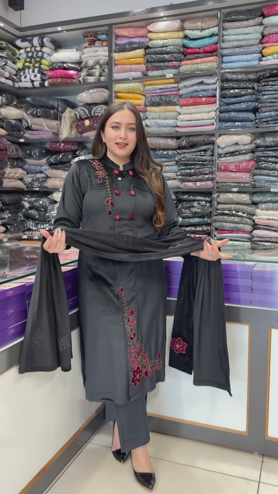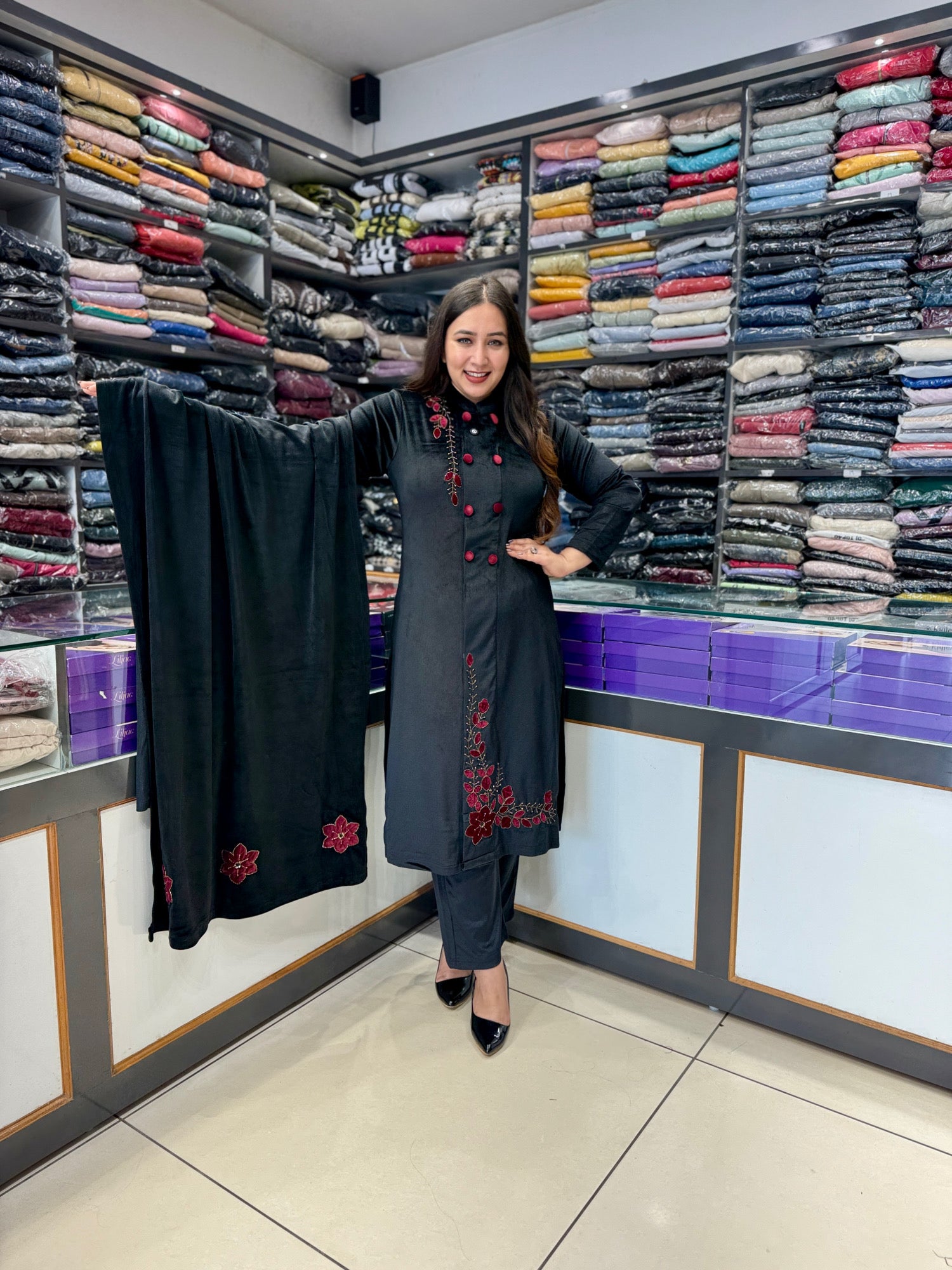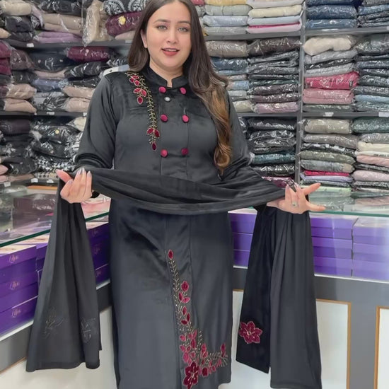 This three-piece velvet corduroy suit set is pure luxury — where rich black meets deep maroon in a colour combination that defines royalty.